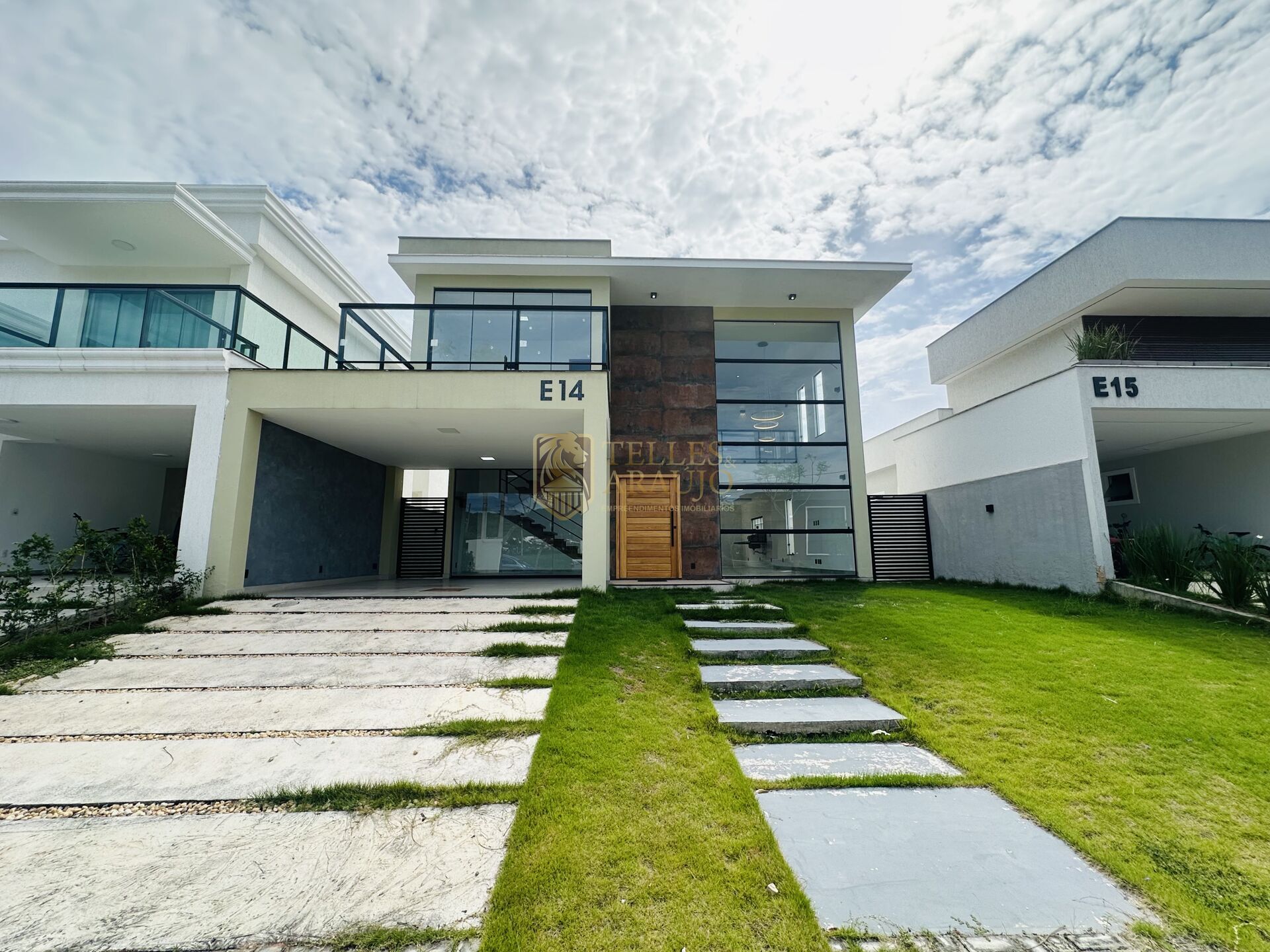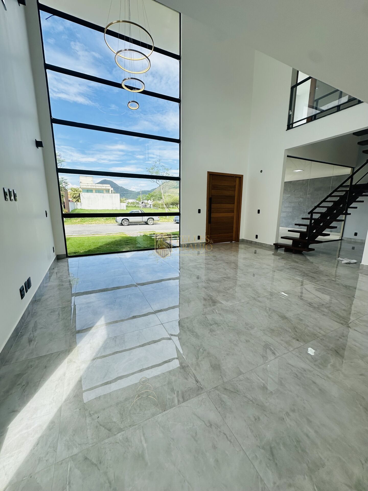 Casa moderna com fachada imponente, marcada por amplo vidro frontal, linhas retas e acabamento em tons sofisticados. O interior possui pé-direito duplo, grande entrada de luz natural e escada flutuante em madeira, trazendo leveza e elegância ao ambiente. Com garagem coberta e área externa integrada ao paisagismo, a residência combina design contemporâneo, luminosidade e estilo.
